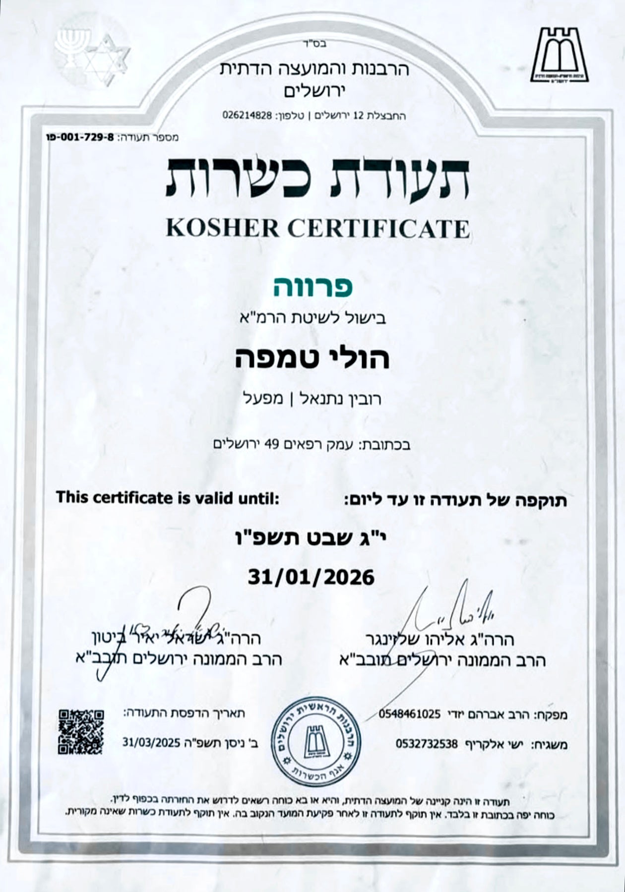 אכן כן. אנחנו מחזיקים בתעודת כשרות בהשגחות הרבנות ירושלים.